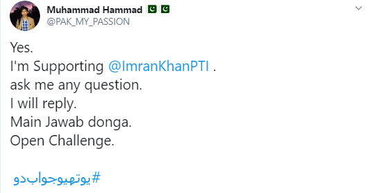 محمد حماد نامی ایک صارف نے لکھا کہ وہ وزیراعظم کی حمایت کرتے ہیں۔ کھلا چیلنج دیتے ہوئے انہوں نے کہا کہ کچھ بھی پوچھیں وہ جواب دیں گے۔