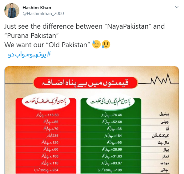 ہاشم خان نامی ایک صارف نے ’نئے پاکستان‘ اور ’پرانے پاکستان‘ کی اصطلاحات استعمال کرتے ہوئے خواہش ظاہر کی کہ انہیں پرانا پاکستان ہی چاہیے۔