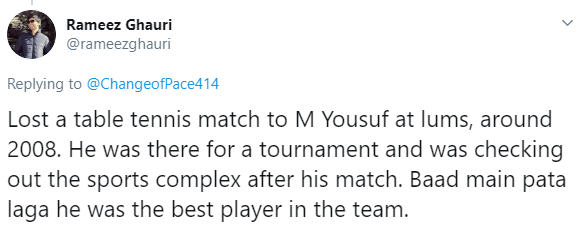 رمیز غوری نے لکھا کہ ’میں 2008 میں لمز یونیورسٹی میں محمد یوسف سے ٹیبل ٹینس میچ ہار گیا وہ اس وقت اپنے ٹورنامنٹ کے بعد سپورٹس کمپلیکس دیکھنے آئے تھے بعد میں پتا چلا کہ وہ پاکستانی ٹیم کے بہترین کھلاڑی تھے۔‘