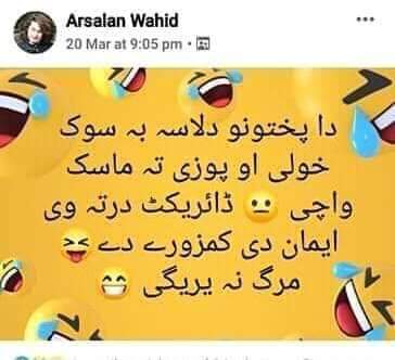 ارسلان واحد نے 20 مارچ کو کی گئی اپنی فیس بک پوسٹ میں لکھا تھا ’پختونوں (کے رویے) کی وجہ سے کوئی اپنا ناک اور منہ ماسک سے نہیں ڈھانپ سکتا۔ (کسی کو ایسا کرتے دیکھ کر) کہتے ہیں کہ اس کا ایمان کمزور ہے، موت سے ڈر رہا ہے۔‘