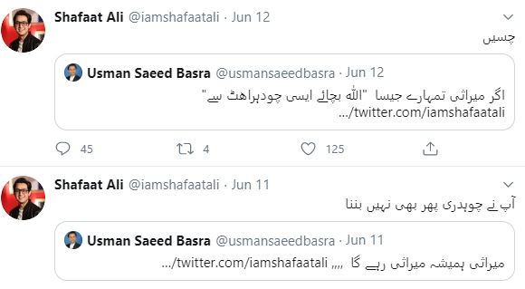 شفاعت علی نے صوبائی ترجمان کو جواب میں لکھا کہ ’آپ نے چودھری پھر بھی نہیں بننا‘ جس پر عثمان سعید نے کہا کہ ’اگر میراثی تمہارے جیسا ہے تو اللہ بچائے ایسی چودھراہٹ سے۔‘