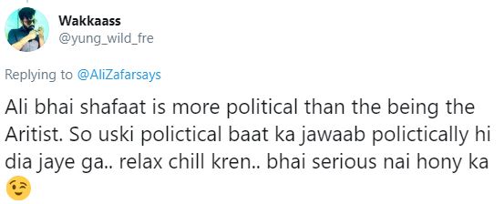 صارف وقاص نے علی ظفر کو جواب میں کہا کہ ’شفاعت علی آرٹسٹ سے زیادہ سیاسی ہیں اس لیے ان کی سیاسی بات کا جواب بھی سیاسی ہی ہوگا، آپ سکون کریں زیادہ سنجیدہ نہ لیں۔‘