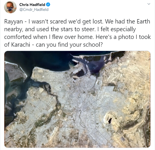 تین خلائی فلائٹس کا حصہ رہنے کے بعد زمین پر واپس آنے والے کینیڈین خلاباز کرس ہیڈفیلڈ نے پاکستانی طلبہ کو جواب دیا تو خلا سے لے گئی ایک تصویر بھی شیئر کی جس پر انہوں نے لکھا کہ یہ کراچی کی ہے۔