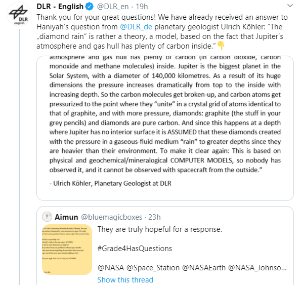 جرمن ایروسپیس سینٹر ڈی ایل آر کے اکاؤنٹ سے کمسن پاکستانی طلبہ کو ایک سے زائد ٹویٹس کے ذریعے ’مشتری پر ہیروں کی بارش ہوتی ہے‘، ’خلائی راکٹ کا ایندھن کیا ہوتا ہے؟‘ سمیت دیگر سوالوں کے جوابات دیے۔