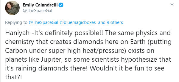 خلائی سائنس اور میڈیا کے شعبے سے متعلق ایملی کیلنڈریلی گفتگو کا حصہ بنیں تو انہوں نے بھی مختلف ٹویٹس کے ذریعے تمام بچوں کے پوچھے گئے سوالات کے جوابات دیے۔
