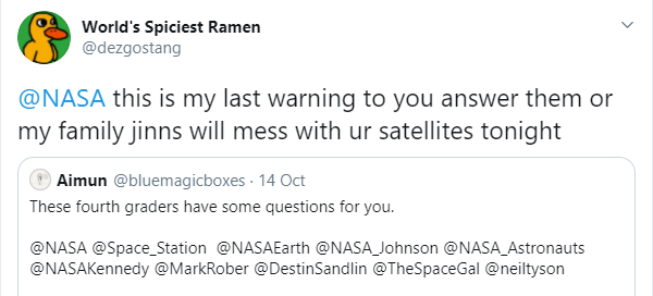 کچھ الگ پیغامات میں انہوں نے لکھا کہ طلبہ و طالبات کے یہ سوال کلاس میں ووٹنگ کے ذریعے منتخب کیے گئے ہیں، اگر ناسا نے جواب نہ دیا تو یہ خاصا حوصلہ شکن ہو گا۔