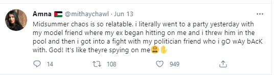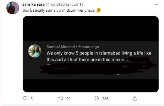 سارا کا سارا نامی ٹوئٹر ہینڈل نے ٹوئٹر پر ایک تحریر شیئر کرتے ہوئے لکھا کہ ’مڈ سمر کیاس‘ کی سب سی اچھی سمری اس تحریر میں ہے۔ تحریر میں لکھا تھا کہ ’ہم صرف پانچ ایسے لوگوں کو جانتے ہیں جو اس طرح کی زندگی گزار رہے ہیں اور وہ سب اس فلم میں ہیں۔‘
