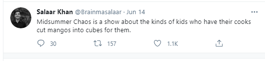 صارف سالار خان نے لکھا کہ ’یہ شو ایسے بچوں کے بارے میں ہے جن کے باورچی ان کے لیے آم کیوبس کی شکل میں کاٹتے ہیں۔‘