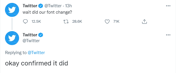 فونٹ کی تبدیلی کی اطلاع ٹوئٹر کے آفیشل ہینڈل پر ایک سوال کی صورت میں دی گئی تھی۔ ابتدائی ٹویٹ کے چند منٹ بعد کی گئی دوسری ٹویٹ میں ٹوئٹر نے تصدیق کی کہ فونٹ تبدیل ہو گیا ہے۔