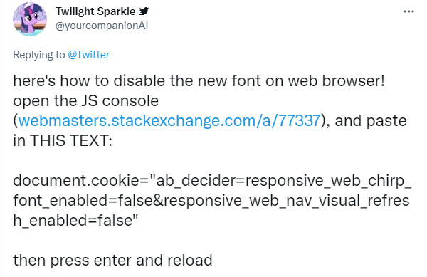 بہت زیادہ افراد نے نئے فونٹ پر تنقید کی تو کوڈنگ سے وابستہ ٹویپس مسئلے کے حل کے ساتھ سامنے آئے اور شکایت کرنے والوں کو بتایا کہ ’وہ کیسے ٹوئٹر کے فونٹ کو تبدیل کر سکتے ہیں۔‘