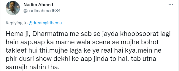 ندیم احمد نامی ٹویپ نے فلم میں ان کے تاثر کو موضوع بناتے ہوئے جہاں خوبصورتی کا اعتراف کیا وہیں یہ اقرار بھی کیا کہ کم فہمی کے باعث فلم میں ہیمامالنی کے مرنے کے سین کو حقیقی سمجھ بیٹھے اور اپنے خیال کی تصدیق کے لیے ان کا دوسرا شو دیکھا تو علم ہوا کہ وہ زندہ ہیں۔