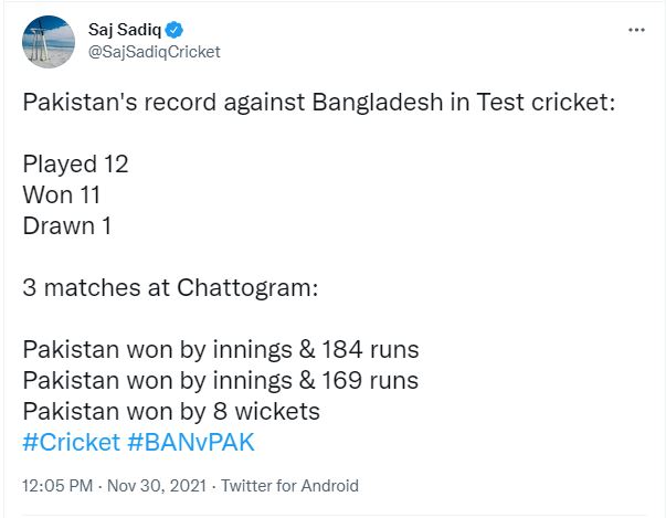 سپورٹس جرنسلٹ ساج صادق نے ایک ٹوئیٹ میں کہا کہ پاکستان اور بنگلہ دیش کے درمیان بنگلہ دیش میں 12 ٹیسٹ میچ کھیلے جس میں سے 11 پاکستان جیتا اور 1 میچ بے نتیجہ رہا۔