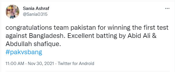 ثانیہ اشرف نامی صارف نے پاکستان کو مبارکباد دیتے ہوئے کہا کہ ’عابد علی اور عبداللہ شفیق نے عمدہ بیٹنگ کی۔‘