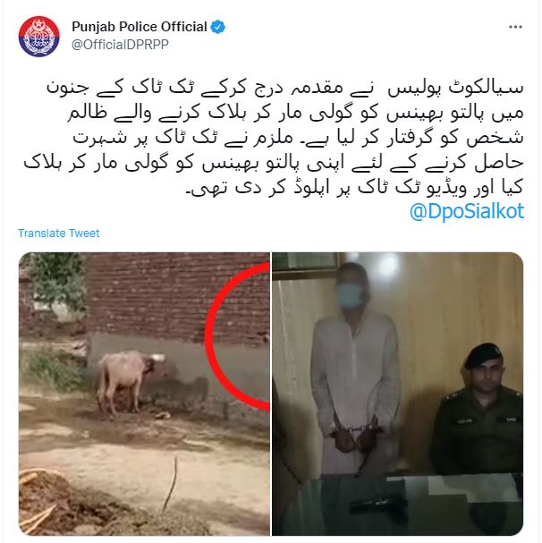 جمعرات کو ایک ٹویٹ میں پنجاب پولیس نے صارفین کو مطلع کیا کہ ’سیالکوٹ پولیس نے مقدمہ درج کرکے ٹک ٹاک کے جنون میں پالتو بھینس کو گولی مار کر ہلاک کرنے والے ظالم شخص کو گرفتار کرلیا ہے۔‘