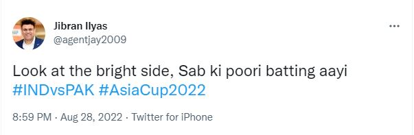 جبران الیاس نے ایک ٹویٹ میں لکھا کہ ’ہمیں روشن پہلو دیکھنے کی ضرورت ہے۔ سب کی پوری بیٹنگ آئی۔‘