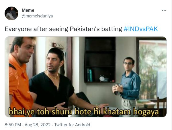 بڑے میچ میں پاکستان کی مایوس کن بیٹنگ نے ایک صارف کو ’منا بھائی ایم بی بی ایس‘ کی بھی یاد دلادی اور ارشد وارثی کی میم ’بھائی یہ تو شروع ہوتے ہی ختم ہوگیا‘ کی بھی واپسی ہوگئی۔