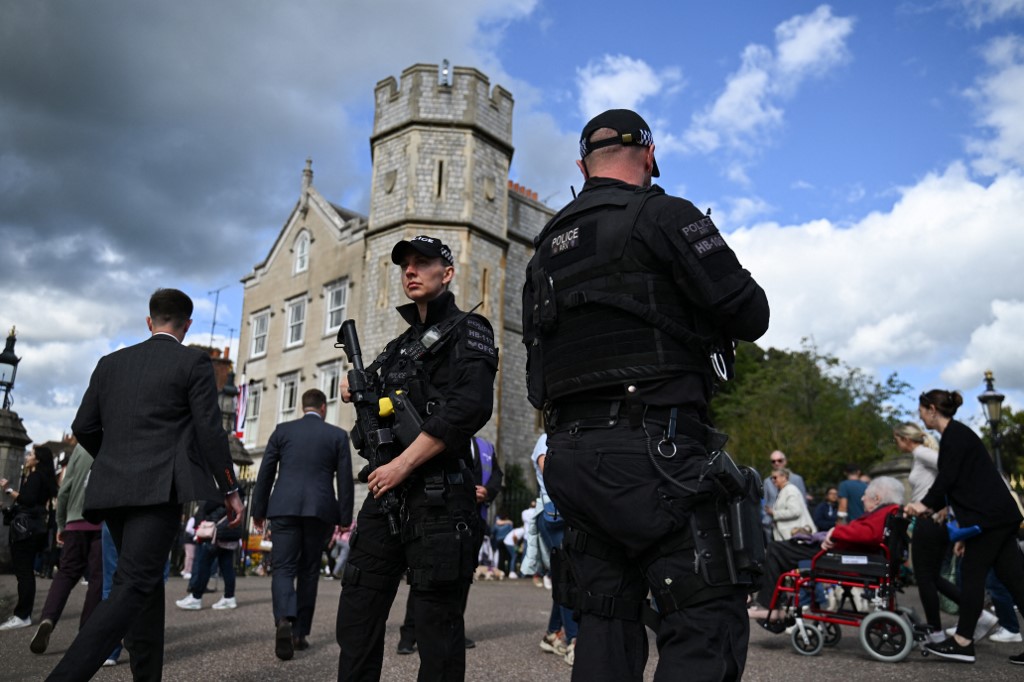 لندن کے ویسٹ منسٹر محل کے باہر پولیس اہلکار چوکس کھڑے ہیں جہاں آنجہانی ملکہ الزبتھ کا تابوت رکھا گیا ہے۔