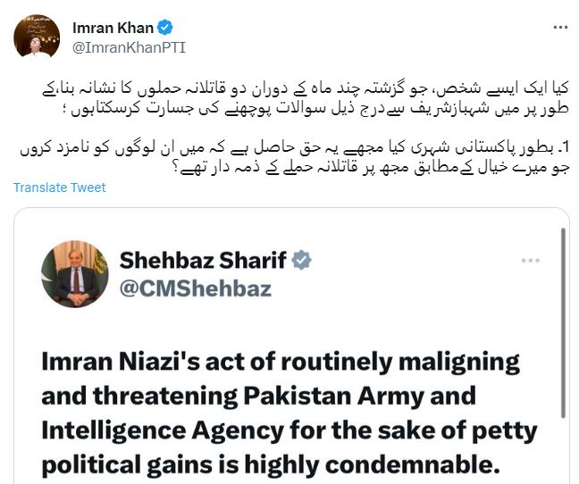 اتوار کی رات کو وزیراعظم پاکستان شہاز شریف نے کہا تھا کہ عمران خان کی جانب سے ’معمولی سیاسی فائدے‘ کے لیے پاکستان آرمی اور ایٹیلیجنس ایجنسیز پر تواتر سے الزامات انتہائی قابل مذمت ہے۔
