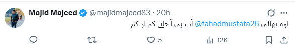 ماجد مجید نے اپنے پوسٹ میں اداکر فہد مصطفیٰ کو ٹیگ کیا اور لکھا کہ بھائی آپ ہی آجاتے کم از کم‘۔ فہد مصطفی نجہ ٹی وی پر جیتو پاکستان گیم شو ہوسٹ کرتے ہیں جس میں وہ عوام میں انعامات تقسیم کرتے کرتے ہیں۔