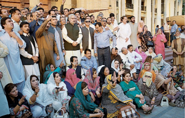 اپوزیشن ارکان نے پلے کارڈز اٹھا رکھے تھے اور بانی پی ٹی آئی عمران خان کی گرفتاری کے خلاف اور کسانوں کے حق میں نعرے بازی کی۔