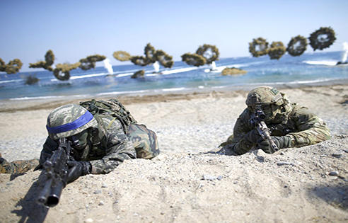 سئیول۔۔۔۔ جنوبی کوریا کی بحریہ کے جنگی جہازوں نے منگل کو فوجی مشقیں شروع کی ہیں جن میں اصلی گولہ بارود استعمال کیا گیا ہے۔ امریکا کی جانب سے شمالی کوریا کو طاقتور فوجی جواب دینے کی دھمکی کے بعد شمالی کوریا نے فوجی مشقوں کا سلسلہ شروع کیا ہے۔ ان مشقوں میں ایف 15 لڑاکا طیاروں نے بھی حصہ لیا۔ دوسری جانب جنوبی کوریا اور امریکا کے صدور نے جنوبی کوریا میں نصب میزائل سسٹم پر سے وارہیڈز کی پابندی ختم کرنے کا بھی فیصلہ کیا ہے۔ اس فیصلے بعد جنوبی کوریا بھی طاقتور ہتھیاروں کی پیداوار شروع کر سکے گا۔ اْدھر سکیورٹی کونسل نے ایک ہفتے کے دوران دوسرے ہنگامی اجلاس میں جزیرہ نما کوریا کی صورت حال کا جائزہ لیا ہے۔