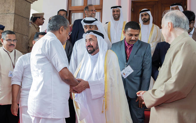 شارجہ: شارجہ کے حکمران شیخ ڈاکٹر سلطان القاسمی کا کیرلہ میں شاندار استقبال کیا گیا۔ استقبالیہ تقریب میں کیرلہ کے اعلی عہدیدارن کے علاوہ تاجر اور سرمایہ کار شریک تھے۔ پر تپاک استقبال پر شیخ سلطان نے کیرلہ حکومت کا شکریہ ادا کیا ۔