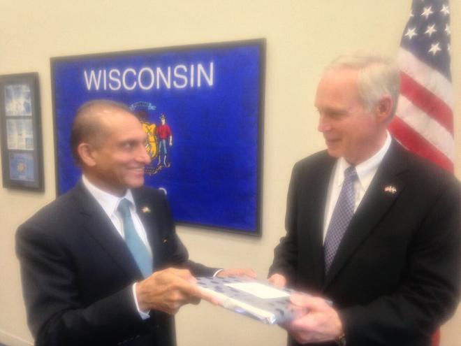 واشنگٹن ...امریکہ میں پاکستانی سفیراعزاز احمدچوہدری نے امریکی سینیٹ کی داخلی سلامتی اور حکومتی امور کی کمیٹی کے چیئرمین رون جانسن سے ملاقات کی۔ انتہاپسندی کیخلاف جنگ میں پاکستان کی کامیابیوں سے آگاہ کیا۔ اعزاز چوہدری نے کہاکہ ا نسداد دہشت گردی کارروائیوں سے سلامتی کی صورتحال میں واضح بہتری آئی ہے۔ انہوں نے کہاکہ معیشت بحال ہورہی ہے۔ غیرملکی سرمایہ کاروں کی دلچسپی میں بھی اضافہ ہواہے۔انہوں نے کہاکہ پاکستان اور امریکہ کوافغانستان میں دہشت گردی کے خطرے میں کمی لانے میں بڑی کامیابی ملی ہے۔ انہوں نے کہا کہ خطے میں امن اور استحکام کیلئے پاکستان اور امریکہ کو ملکر کام کرنے کی ضرورت ہے۔سینیٹر رون جانسن نے بھی مشترکہ اہداف کے حصول کیلئے پاکستان اور امریکہ کے درمیان مسلسل تعاون کی اہمیت پر زور دیا۔
