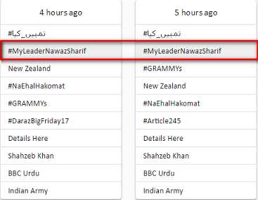 پاکستان میں پھیلی پیچیدہ سیاسی صورتحال کی وجہ سے ہر پارٹی ایک دوسری کو نیچا دکھانے کی کوشش کر رہی ہے۔کبھی الیکٹرانک میڈیا کے ذریعے اور کبھی سوشل میڈیا کے ذریعے۔ٹویٹر ٹرینڈ بھی انہی ذرائع میں سے ایک ذریعہ ہے۔کوئی اپنی پارٹی کی حمایت میں ٹرینڈ لاتا ہے تو کوئی دوسری پارٹی کے خلاف۔اس وقت ہیش ٹیگ#میرا_لیڈر_نواز_شریف پاکستان بھر میں تیسرے نمبر پر ریکارڈ کیاجارہاہے۔یہ ٹرینڈ لسٹ میں آتے ہی دوسرے نمبر پر ریکارڈ کیا گیا۔ اس کے بعد اتار چڑھاو¿ کا شکار ہوتا رہا البتہ عالمی رینکنگ میں ابھی تک یہ ٹرینڈ جگہ بنانے میں ناکام رہاہے۔نواز شریف کے حمایتیوں کے ٹویٹس ملاحظہ ہوں: