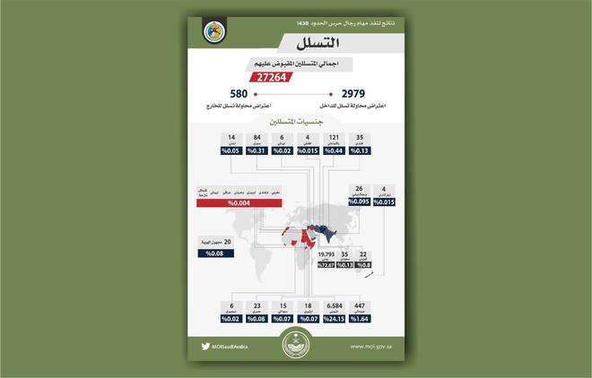 ریاض۔۔۔سعودی عرب کے متعلقہ حکام نے 23ممالک کے 27264درانداز گرفتار کر لئے۔ ان میں 121پاکستانی ، 25ہندوستانی اور 26بنگلہ دیشی بھی شامل ہیں۔ سرکاری ذرائع کا کہنا ہے کہ دراندازوں میں سب سے زیادہ یمن کے ہیں جن کی تعداد 19793ہے۔ یہ کل گرفتار شدگان کا 72فیصد ہیں۔ ایتھوپیا کا نمبر دوسرا ہے۔ جہاںکے 6584شہری پکڑے گئے یہ کل گرفتار شدگان کا 24فیصد ہیں۔ 23ممالک کے 27264 دراندازی کرتے ہوئے پکڑے گئے۔ تفصیلات کے مطابق ان میں سے 26047مملکت میں غیر قانونی طریقے سے گھستے وقت اور 1217مملکت سے غیر قانونی طریقے سے نکلتے وقت گرفتار کئے گئے ہیں۔ 20نامعلوم شہریت والے گرفتار کئے گئے۔ 4نیوزی لینڈ کے پکڑے گئے۔ گرفتار شدگان میں افغانی ، ایرانی ، شامی ، اردنی ، کویتی ، سعودی ، یمنی ، صومالی، ایتھوپین، اریٹریا، سوڈانی، مصری ، نائیجرین، مراکشی ،بحرینی،عراقی ، نیپالی ، لائبرین، یوگنڈا اور نقل مکانی کرنے والے قبائل کے لوگ شامل ہیں۔ منشیات کی اسمگلنگ کی 6447کوششیں ناکام بنائی گئیں۔ مختلف قسم کے 3559اسلحہ ضبط کئے گئے۔ ان میں 5فوجی ہتھیار، 3ٹینک شکن میزائل ، 46بارودی سرنگیں، 21شدید دھماکہ خیز بم، 6آر بی جی گولے، 21تباہ کن پیکٹ ، 406مشین گنیں اور 6لاکھ 45ہزار سے زیادہ گولیاں ضبط کی گئیں۔ضبط شدہ نشہ آور مواد میں 17.4ملین نشہ آور گولیاں سرفہرست رہیں۔