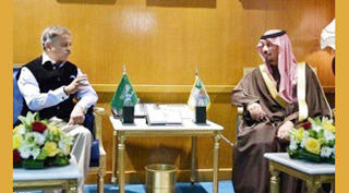 ریاض .... سعودی وزیر نیشنل گارڈ شہزادہ خالد بن عیاف سے پیر کو ریاض کے دفتر میں سفیر ہند احمد جاوید ملاقات کرکے باہمی دلچسپی کے امور پر تبادلہ خیال کیا۔ اس موقع پر سعودی قومی ثقافت کے ترجمان جنادریہ میلے میں ہندوستان کے مہمان خصوصی کے طور پر شرکت کے امور کا جائزہ لیاگیا