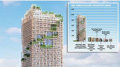 ٹوکیو..... ٹوکیو میں ایک ایسا چوبی اسکائی اسکریپر تیار کیا جارہا ہے جو 1148فٹ بلند ہوگا۔ اس میں مکانات، دکانیں ، آفس کی جگہیں اور ایک ہوٹل بھی تعمیر کیا جائیگا۔70منزلہ یہ عمارت لکڑی سے تیار کردہ ہوگی اور جاپان میں سب سے زیادہ طویل ہوگی۔ 2041ءتک اسے مکمل کرلیا جائیگا۔ کچھ حصہ اسٹیل کا بھی استعمال ہوگا لیکن 90فیصد لکڑی استعمال ہوگی۔اس طویل عمارت کا مقصد یہ ہے کہ جاپان کو ماحولیات دوست شہر قرار دلایا جاسکے۔ اس عمارت کی تعمیر پر 4.2بلین پونڈ خرچ ہونگے۔ ٹوکیو میں قائم ایک فرم نے اسکا ڈیزائن تیار کیا ہے۔ ابھی یہ واضح نہیں کہ آیا اس عمارت کےلئے لکڑی کا انتخاب کرلیا گیا ہے۔ اس عمارت کی تعمیر میں تقریباً6.5ملین کیوبک فٹ لکڑی استعمال ہوگی۔ یہ بھی بتایا جاتا ہے کہ 174فٹ کی بلندی پر ایک اقامتی اسکول بھی ہوگا۔یہ عمارت لکڑی سے تعمیر ہونے والی دنیا کی بلند ترین عمارت کہلائے گی۔ واضح رہے کہ جاپان میں زیادہ تر لکڑی کے مکانات بنتے ہیں لیکن جلد آگ پکڑنے کیوجہ سے اب اس پر پابندی لگادی گئی ہے۔ ابھی حال ہی میں 2020ءکے اولمپکس گیمز کیلئے بھی ایک اسٹیڈیم تعمیر کیا جارہا ہے جس میں لکڑی کا استعمال کیا گیا ہے۔