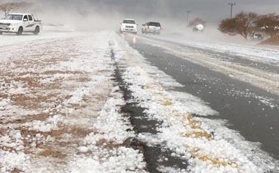جدہ ..... مدینہ منورہ اور مضافات میں تبوک کی جانب ہائی وے پر ہفتے کو بارش کے ساتھ شدید ژالہ باری ہوئی ۔ شہر میں اولوں سے بعض گاڑیوں کے شیشے بھی ٹوٹ گئے جس سے شہریوں کو شدید دشواری کا سامنا کرنا پڑا ۔ مضافاتی علاقوں میں پڑنےوالے اولے خطرناک ثابت ہوئے جس سے کھلے باڑوں میں بعض مویشیوں کی ہلاکت کی بھی اطلاعات موصول ہوئی ۔ مدینہ منورہ سے 100 کلو میٹر تبوک کی سمت " فقرہ " نامی بستی میں ہونے والی ژالہ باری " برف باری " کا منظر پیش کررہی تھی ۔ اولوں سے سڑک اور اطراف کے میدان نے سفید چادر اوڑھ لی تھی جبکہ بادل اس قدر نیچے تھے کہ چند فٹ دور دیکھنا بھی مشکل ہو گیا تھا ۔