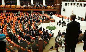 انقرہ.... ترک پارلیمنٹ نے اس قراردادکی منظوری دے دی، جس کے تحت عام پارلیمانی اور صدارتی انتخابات کا انعقاد رواں برس 24 جون کو کیا جائےگا۔ اس قرارداد کی رائے شماری کے وقت کرد نواز اپوزیشن پارٹی ڈیموکریٹک پارٹی نے پارلیمانی کارروائی کا بائیکاٹ کیا۔ قبل از وقت الیکشن کرانے کے حق میں 550 رکنی ایوان میں سے 386 اراکین نے ووٹ ڈالا۔ ووٹنگ میں حکمران سیاسی جماعت کو انتہائی دائیں بازو کی نیشنلسٹ موومنٹ پارٹی کی حمایت حاصل تھی۔ ترکی میں قبل از وقت انتخابات کرنے کا اعلان 2 روز قبل ترک صدر رجب طیب اردگان نے کیا تھا۔