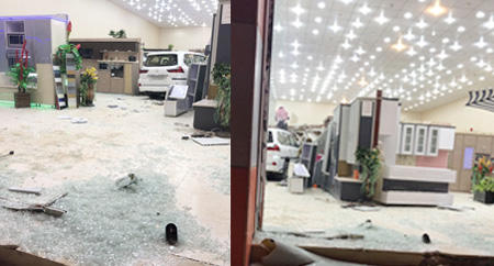 رفحاء.... رفحاءکمشنری میں کنگ عبداللہ روڈ پر” المونیم کچن شوروم “ میں گاہک اور سیلز مین چین و سکون کے ساتھ ایک دوسرے سے گپ شپ میں مصروف تھے کہ اچانک برق رفتار لکزس اندر آئی اور تمام فرنیچر اور سامان الٹ پلٹ کرتے ہوئے دیوار سے ٹکرا کر رک گئی۔ شو روم کے مالک کا کہناہے کہ وہ شو روم میں بیٹھا ہوا تھا۔ گاہکوں سے بات چیت جاری تھی۔تیز رفتار لکزس بیرونی شیشے کے دروازے توڑتے ہوئے اندر گھس گئی۔ شو روم کو کافی نقصان پہنچا۔ گاڑی میں بھی ٹوٹ پھوٹ ہوئی البتہ کوئی جانی نقصان نہیں ہوا۔ ڈرائیو رکا کہناہے کہ گاڑی اس کے کنٹرول سے نکل گئی تھی۔ اس نے اسپیڈ فکسڈ کررکھی تھی جو فنی خرابی کے باعث قابوسے باہر ہوگئی تھی۔