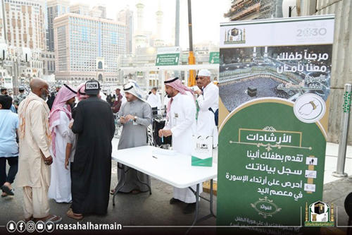 مکہ مکرمہ ۔۔۔ مسجد الحرام کی انتظامیہ کے اہلکار حرم شریف کے دروازوں پر ننھے زائرین کی حفاظتی کارروائی کررہے ہیں۔ انتظامیہ نے ”طفلک معنا بامان“ (آپ کا بچہ ہمارے پاس محفوظ ہاتھوں میں) کے عنوان سے بچوں کی نگہداشت کا نیا نظام شروع کیا ہے۔ ہر بچے کے ہاتھ میں حفاظتی بیلٹ لگایا جارہا ہے۔ اس میں بچے کے ذمہ داران سے رابطے کا نمبر بھی درج ہوتا ہے۔ بچے سے متعلق تمام معلومات بھی ریکارڈ کی جارہی ہیں۔