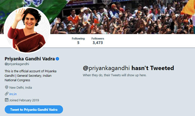 پرینکا گاندھی کا ٹویٹر اکاؤنٹ جاری
