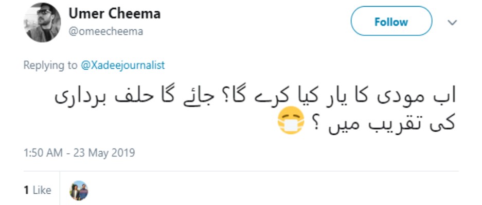 عمر چیمہ نامی صارف نے طنز کرتے ہوئے کہا ’اب مودی کا یار کیا کرے گا، جائے گا حلف برداری کی تقریب میں؟‘