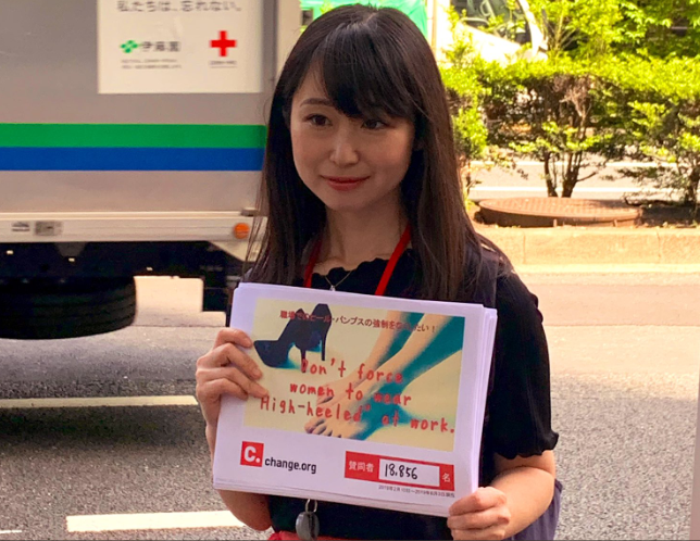 پیٹیشن اداکارہ اور مصنفہ یومی اشیکاوا نے داخل کروائی جس میں انہوں نے ایسے قوانین متعارف کروانے کا مطالبہ کیا جن کے تحت کمپنیوں کو منع کیا جائے کہ وہ خواتین ملازمین کو ایڑھی والے جوتے پہننے کا پابند نہ کریں۔