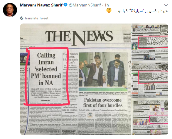 جب ٹوئٹر پر سیاسی بحث گرم ہو اور بات بھی عمران خان کے بارے میں ہو رہی ہو تو سابق وزیر اعظم کی صاحبزادی مریم نواز کسی سے پیچھے کیسے رہ سکتی ہیں۔ انہوں نے ٹوئٹر پر خبروں کے سکرین شارٹس شیئر کرتے ہوئے لکھا کہ ’خبردار کسی نے سلیکٹڈ کہا تو‘