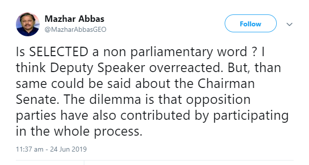 صحافی مظہر عباس نے اپنی ٹویٹ میں سوال اُٹھایا کہ ’کیا سلیکٹڈ غیر پارلیمانی لفظ ہے؟‘