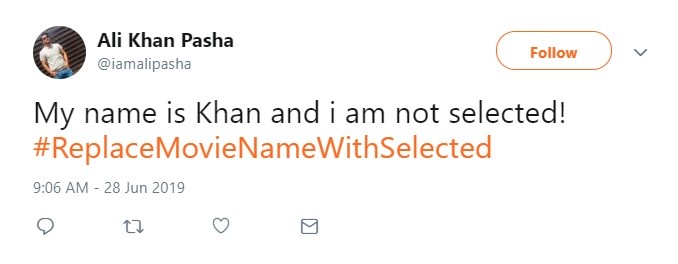 بالی وڈ کی فلم ’مائی نیم از خان‘ میں اداکار شاہ رخ خان کے مشہورِ زمانہ ڈائلوگ کو استعمال کرتے ہوئے علی خان پاشا نام کے ایک صارف نے لکھا ہے کہ ’مائی نیم از خان اینڈ آئی ایم ناٹ سلیکٹڈ‘، جس کے معنی ہیں ’میرا نام خان سے اور میں سلیکٹڈ نہیں‘۔