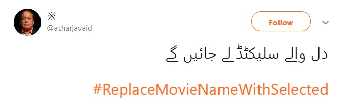 ‘اطہر جاوید نام کے صارف نے فلم ’دل والے دلہنیا لے جائیں گے‘ پر لکھا ’دل والے سلیکٹڈ لے جائیں گے۔
