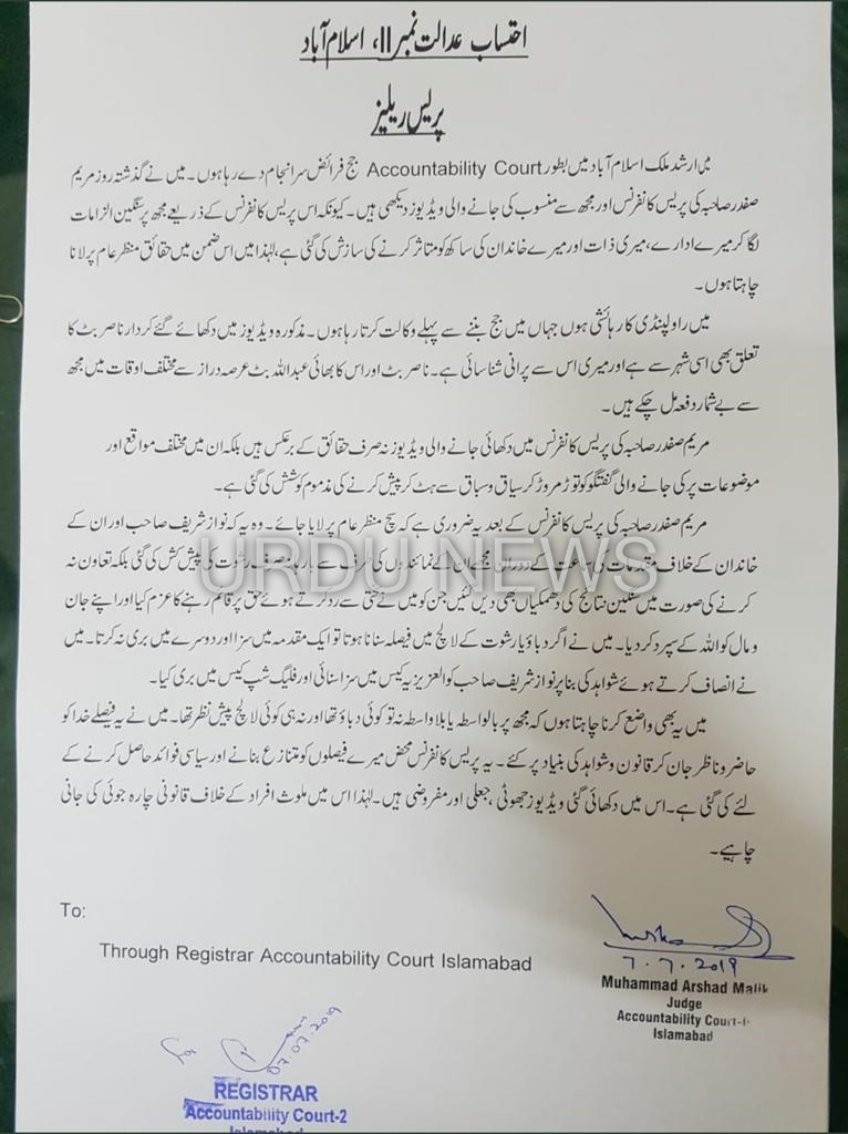 اتوار کو ارشد ملک کی جانب سے جاری کردہ بیان کے مطابق انھوں نے کہا ہے کہ ’مریم صفدر صاحبہ کی پریس کانفرنس میں دکھائی جانے والی ویڈیوز نہ صرف حقائق کے برعکس ہیں بلکہ ان میں مختلف مواقع اور موضوعات پر کی جانے والی گفتگو کو توڑ مروڑ کر سیاق و سباق سے ہٹ کر پیش کرنے کی مذموم کوشش کی گئی ہے۔‘