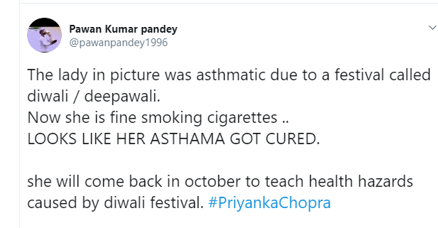 ایک صارف نے لکھا: ’دیوالی کے تہوار پر پرینکا چوپڑہ دمے کا شکار تھیں۔ اب وہ دمے سے بچنے کی دوا لے رہی ہیں۔ منفاقت اپنی بلندی پر ہے۔‘