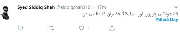سوشل میڈیا پر ایسے صارفین نے بھی اس ہیش ٹیگ کو استعمال کیا ہے جو بظاہر حکومت اور اپوزیشن دونوں سے ناراض نظر آتے ہیں۔ سید صدیق شاہ نامی ٹوئٹر ہینڈل سے لکھا گیا ہے کہ ’25 جولائی چوروں اور سلیکٹڈ حکمران کا عالمی دن ہے۔‘