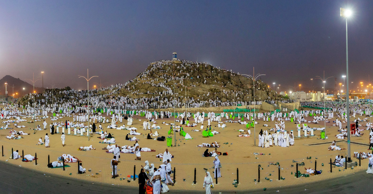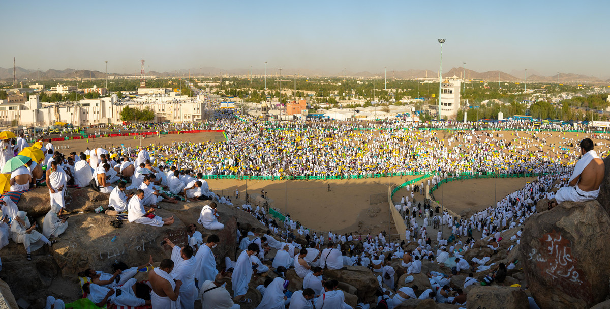 حجاج میدان عرفات کےعین وسط میں موجود جبل رحمۃ پر بیٹھے نظر آرہے ہیں