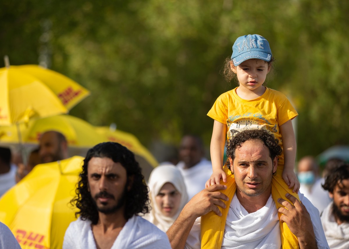 منی سے میدان عرفات پیدل سفر کرتے ہوئے ایک حاجی نے اپنی بیٹی کو کندھوں پر بٹھا رکھا ہے