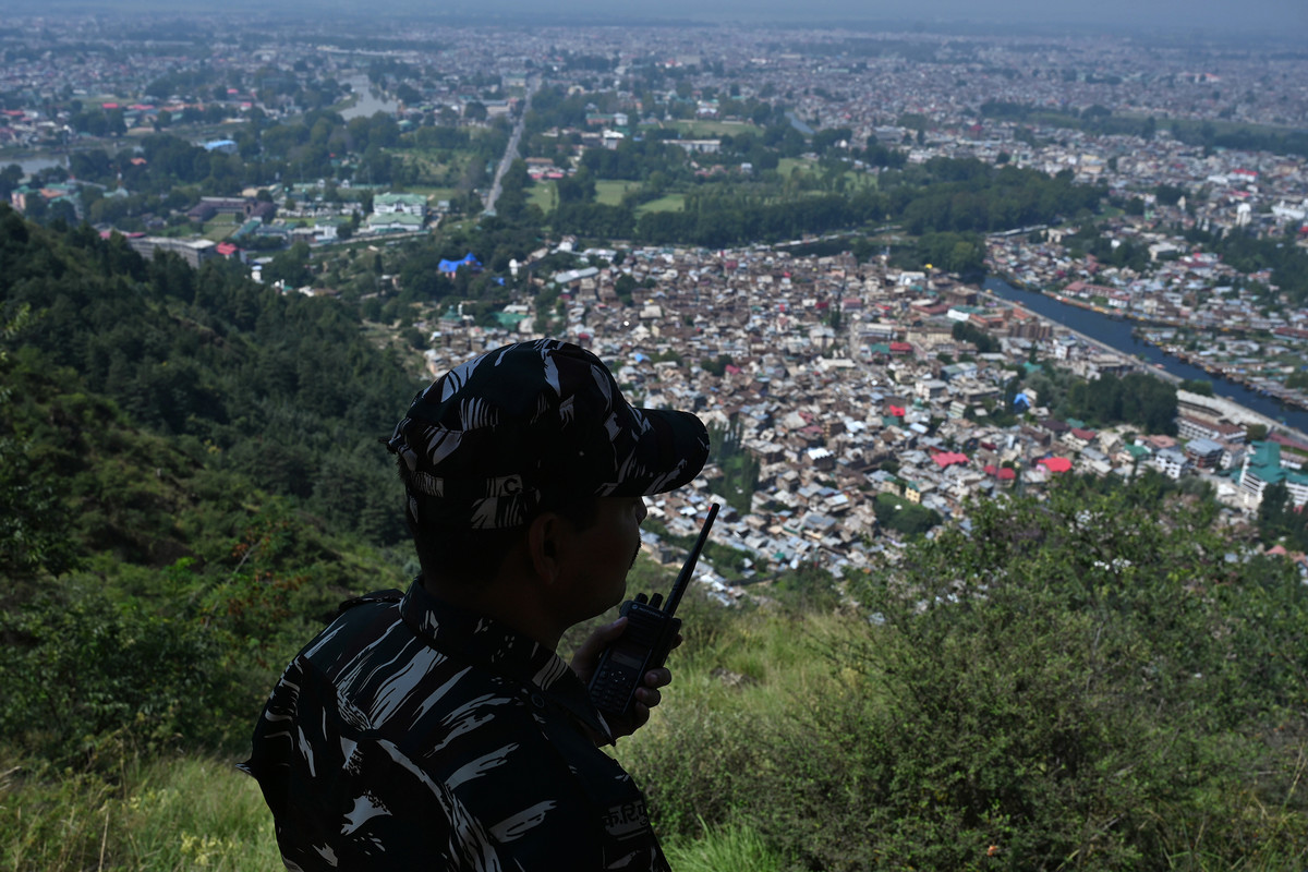 سری نگر میں انڈین سکیورٹی فورسز کا اہلکار ایک پہاڑی پر کھڑا علاقے میں امن و امان کی صورت حال کا جائزہ لے رہا ہے۔