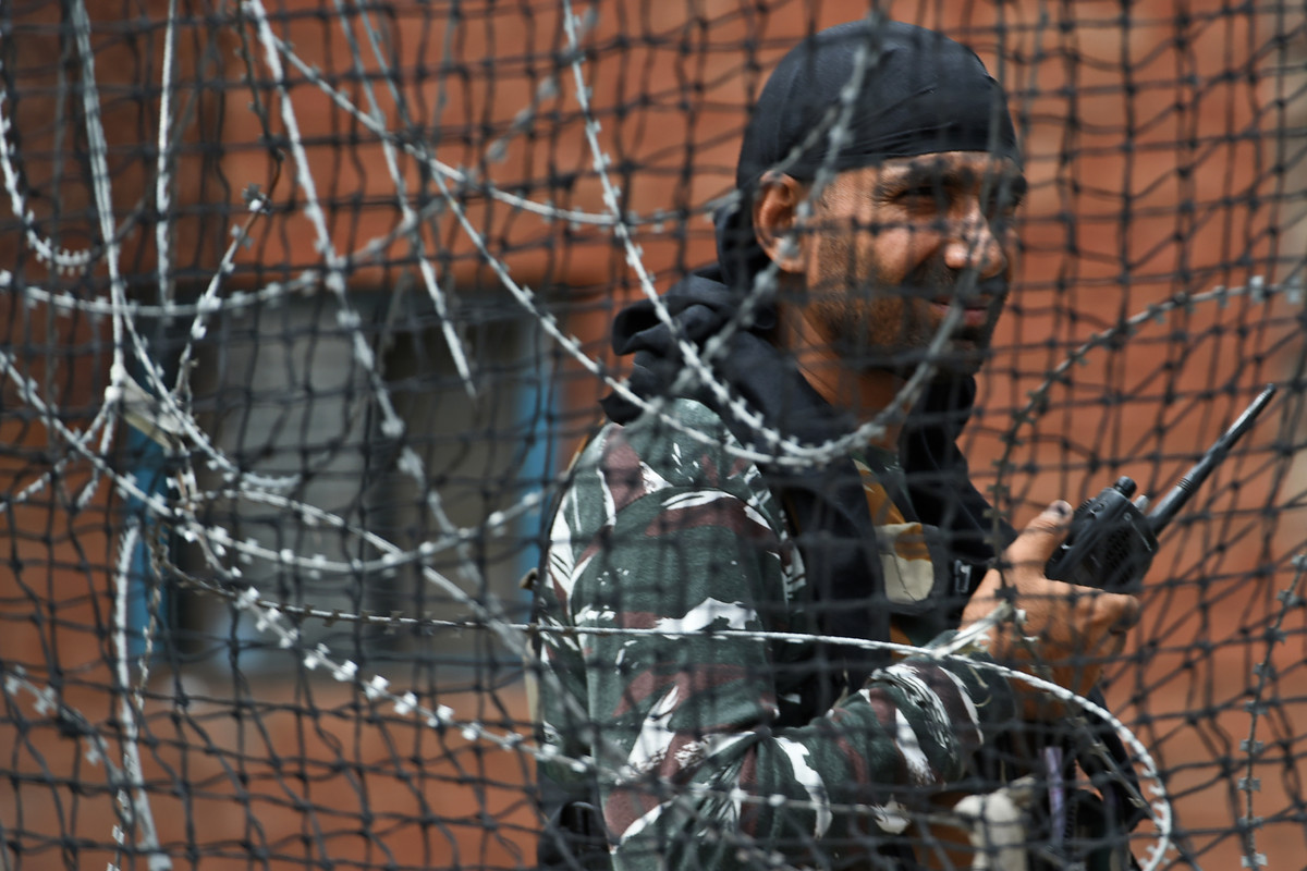 انڈین پیرا ملٹری فورسز کا اہکار سری نگر میں خاردار تاروں کے پیچھے کھڑا سکیورٹی کی صورت حال کا جائزہ لے رہا ہے۔