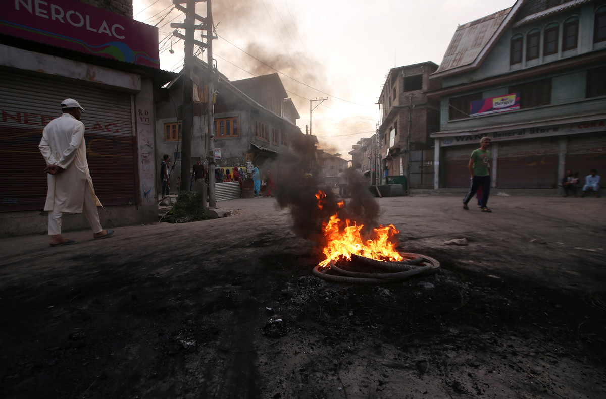 مقامی افراد سری نگر میں جلتے ہوئے ٹائروں کے پاس سے گزر رہے ہیں جنہیں انڈین حکومت کے فیصلے کے خلاف احتجاج کے دوران جلایا گیا تھا۔